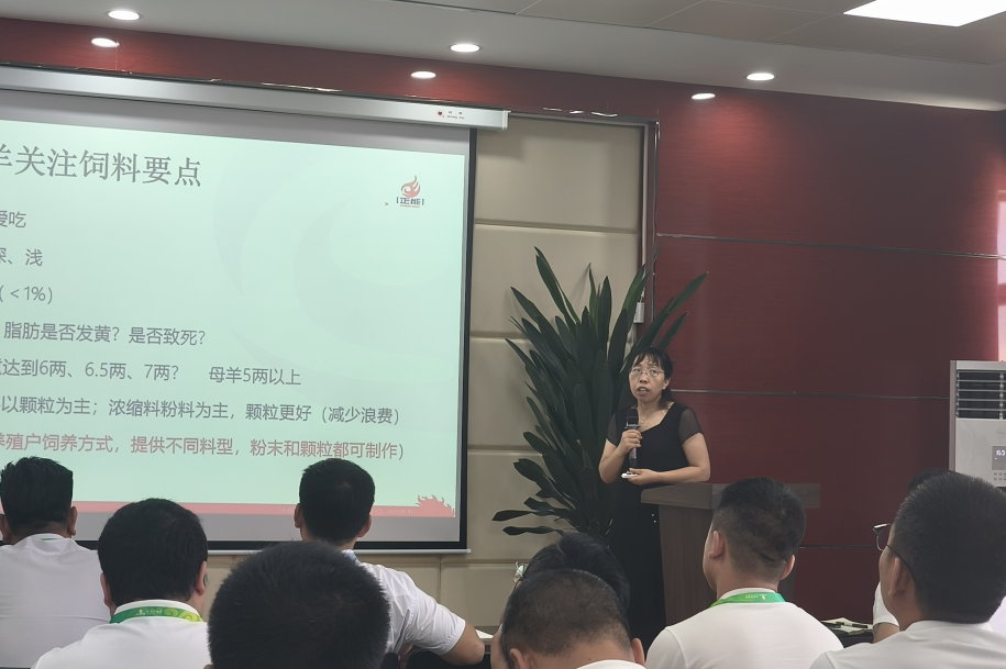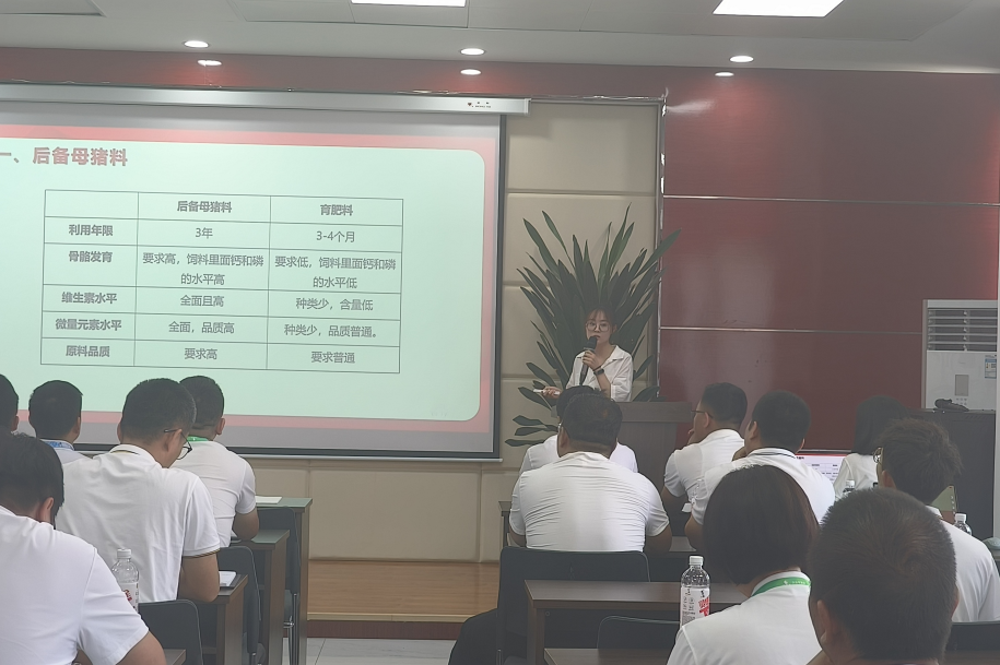 其次由反芻專家杜紅芳老師對反芻產品以及新增產品相關營養指標做了詳細的介紹,然后由技術研發部趙詩瑜老師對正能全系列豬料產品知識及豬場相關實證數據做了詳細介紹。